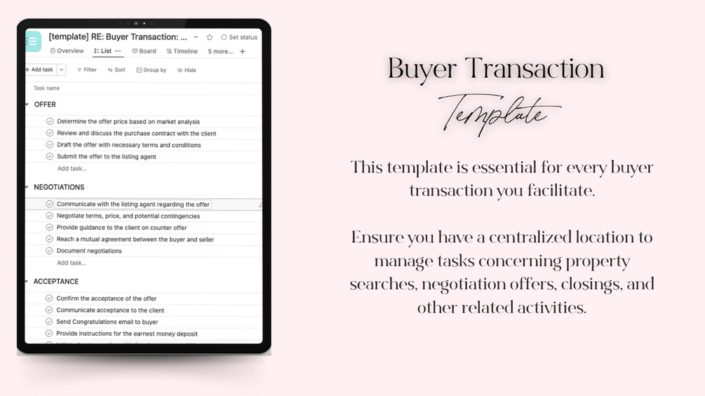 Buyer Transaction: Say goodbye to scattered task lists. This template offers a centralized spot for every buyer transaction, making sure nothing slips through the cracks.
