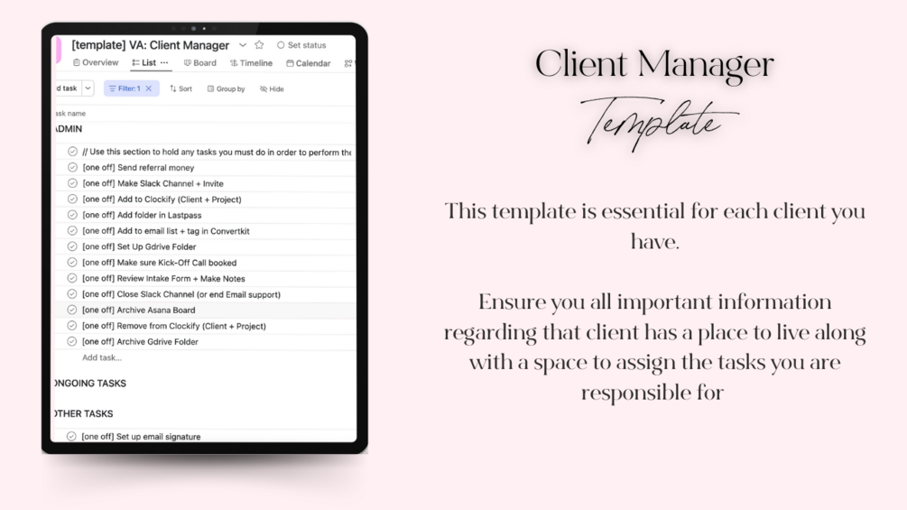 Introducing the ultimate Asana Project Board Virtual Assistants Template Bundle tailored for Virtual Assistants! This digital bundle is your key to staying organized and on top of every task. Whether you're juggling client tasks, ensuring your booking is up to date, or trying to manage incoming leads, these templates have got you covered.